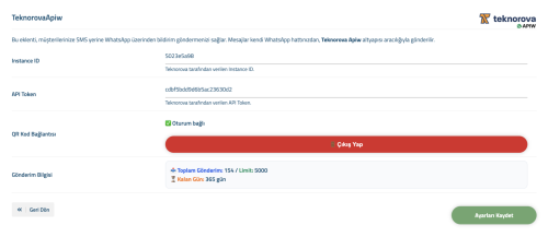 After purchasing the Apiw product through Teknorova, extract the downloaded module archive (.zip) and upload it to the coremio/modules/SMS/ directory. Then, using the Instance ID and API Token we have provided, go to WiseCP > Settings > SMS Settings, select the TeknorovaApiw module, and easily complete the activation.