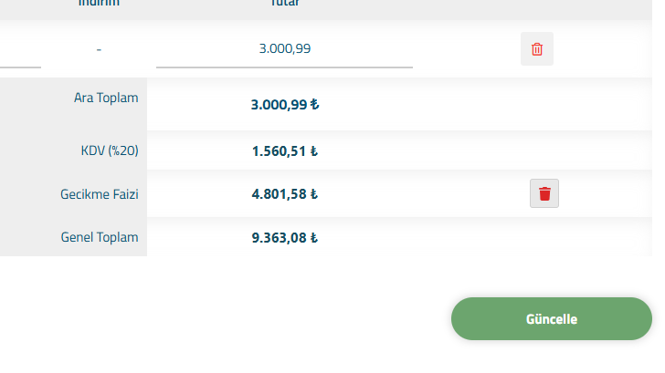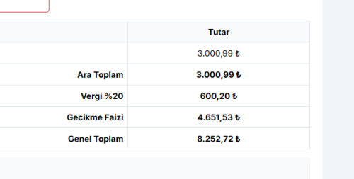 Vadesi geçen faturalar için gecikme ücreti otomatik olarak ayrı bir kalem şeklinde eklenir.
