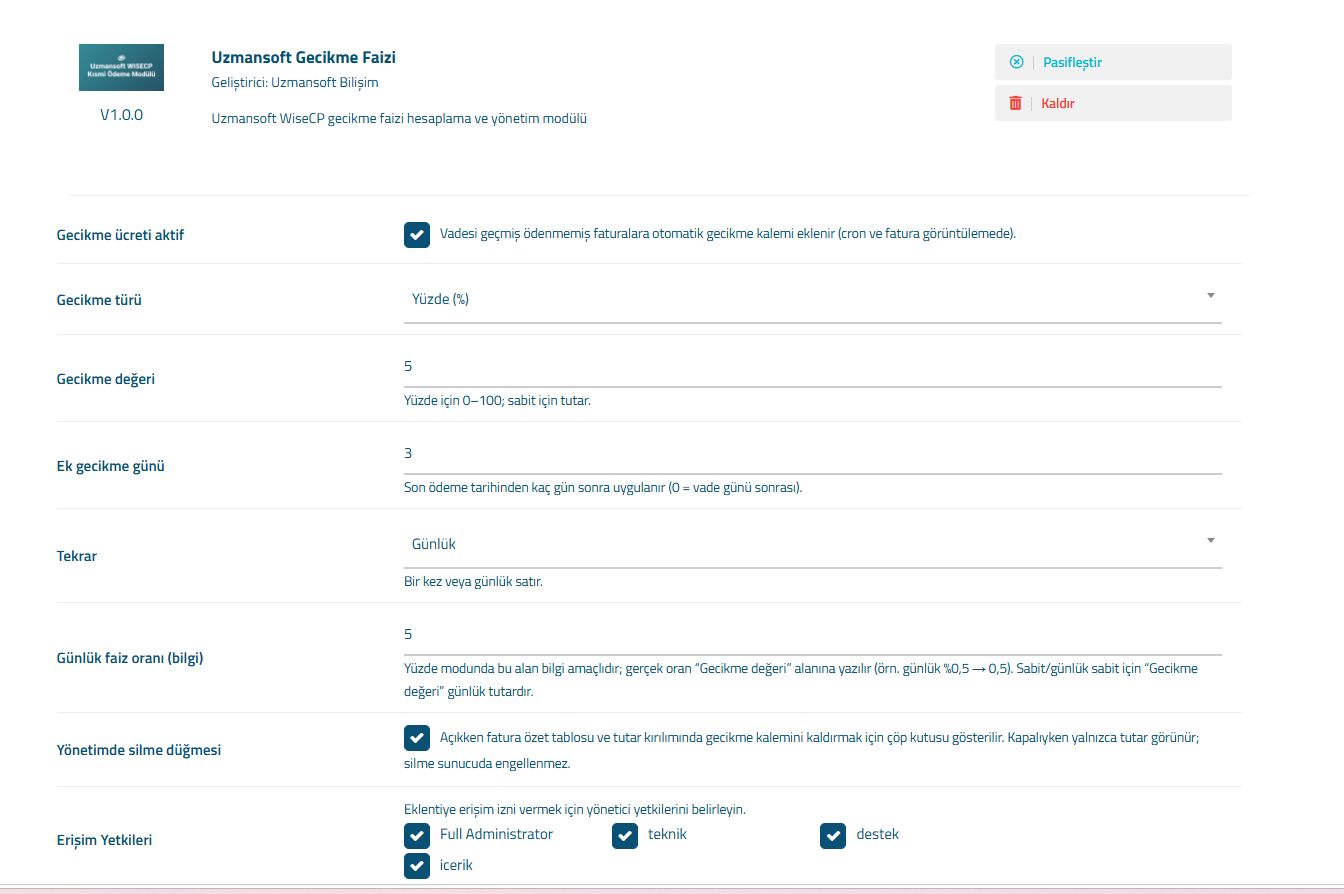 Uzmansoft WiseCP Gecikme Faizi Modülü