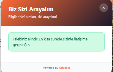 Hemen Satın Al**MySQL Gerektirmez** - JSON dosya tabanlı depolama - ✅ **Kolay Entegrasyon** - Tek satır kod ile sitenize ekleyin - ✅ **Özelleştirilebilir** - Renkler, metinler ve konum ayarlanabilir - ✅ **Mobil Uyumlu** - Tüm cihazlarda mükemmel görünüm - ✅ **Admin Paneli** - Gelen talepleri yönetin - ✅ **E-posta Bildirimi** - Yeni talepler e-posta ile bildirilir - ✅ **AJAX Tabanlı** - Sayfa yenilenmeden form gönderimi